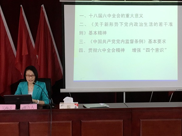 吳梅芳教授從全面從嚴(yán)治黨的高度,深刻闡述了黨的十八屆六中全會(huì)的重大意義,緊緊圍繞加強(qiáng)和規(guī)范黨內(nèi)政治生活的重要性等四個(gè)方面對(duì)《關(guān)于新形勢(shì)下黨內(nèi)政治生活的若干準(zhǔn)則》進(jìn)行了重點(diǎn)解讀,并就《中國共產(chǎn)黨黨內(nèi)監(jiān)督條例》修訂的內(nèi)容和特點(diǎn)等方面作了提煉分析,對(duì)學(xué)習(xí)貫徹黨的十八屆六中全會(huì)精神、不斷強(qiáng)化“四個(gè)意識(shí)”提出了具體要求。她的報(bào)告系統(tǒng)全面,層次分明,站位高、解讀準(zhǔn)、接地氣,既有理論深度,又有生動(dòng)實(shí)例,對(duì)廣大黨員干部學(xué)習(xí)領(lǐng)會(huì)和掌握黨的十八屆六中全會(huì)精神,全面提升企業(yè)黨建工作水平具有重要的指導(dǎo)意義和促進(jìn)作用。