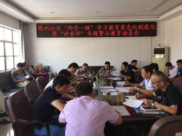 7月18日上午,滁州市公司召開全市“兩學一做” 學習教育常態(tài)化制度化暨“講重作”專題警示教育動員會,各縣(市)公司黨政負責人、市公司部門負責人以上人員及黨員、預備黨員、入黨積極分子參加了會議。會議由市公司副經(jīng)理、副局長王春雷同志主持。