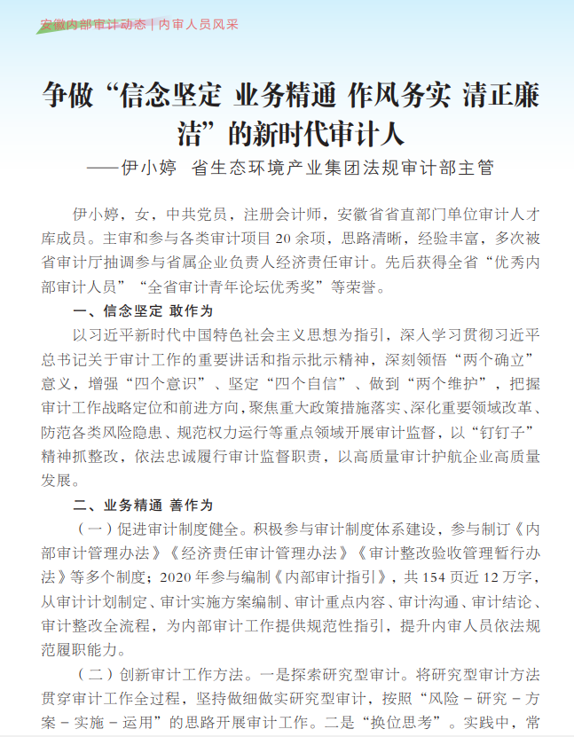 11月14日,集團公司法規(guī)審計部主管伊小婷同志被省審計廳編印的《安徽內(nèi)部審計動態(tài)》第3期——“內(nèi)審人員風(fēng)采”欄目宣傳報道。