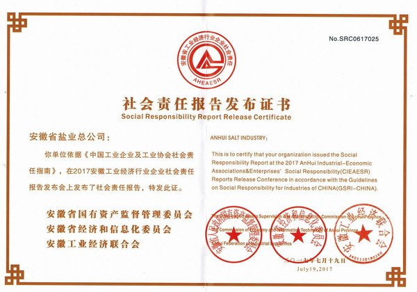 7月19日,2017安徽省企業(yè)社會責任報告發(fā)布會在合肥召開。會上,《安徽鹽業(yè)2016社會責任報告》公開發(fā)布,這也是省公司連續(xù)第三年公開發(fā)布企業(yè)社會責任報告。