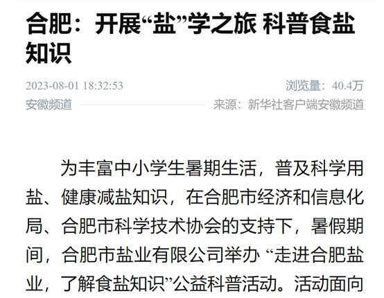 隨著“請進來”食鹽科普游活動深入開展,得到新華社、新華網(wǎng)、北京科技報、安徽科技報等省級以上媒體關(guān)注和報道,其中新華社報道瀏覽量達40.4萬人次。