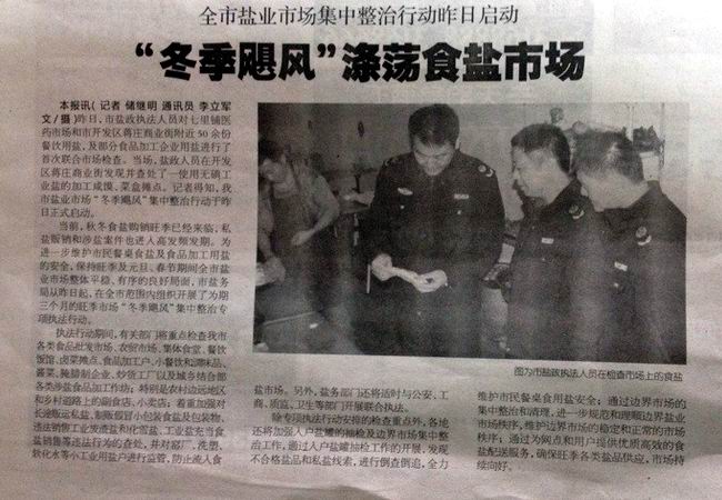 昨日,市鹽政執(zhí)法人員對七里鋪醫(yī)藥市場和市開發(fā)區(qū)蔣莊商業(yè)街附近50余份餐飲用鹽,及部分食品加工企業(yè)用鹽進行了首次聯(lián)合市場檢查。當場,鹽政人員在開發(fā)區(qū)蔣莊商業(yè)街發(fā)現(xiàn)并查處了一使用無碘工業(yè)鹽的加工咸饃、菜盒攤點。記者得知,我市鹽業(yè)市場“冬季颶風”集中整治行動于昨日正式啟動。
