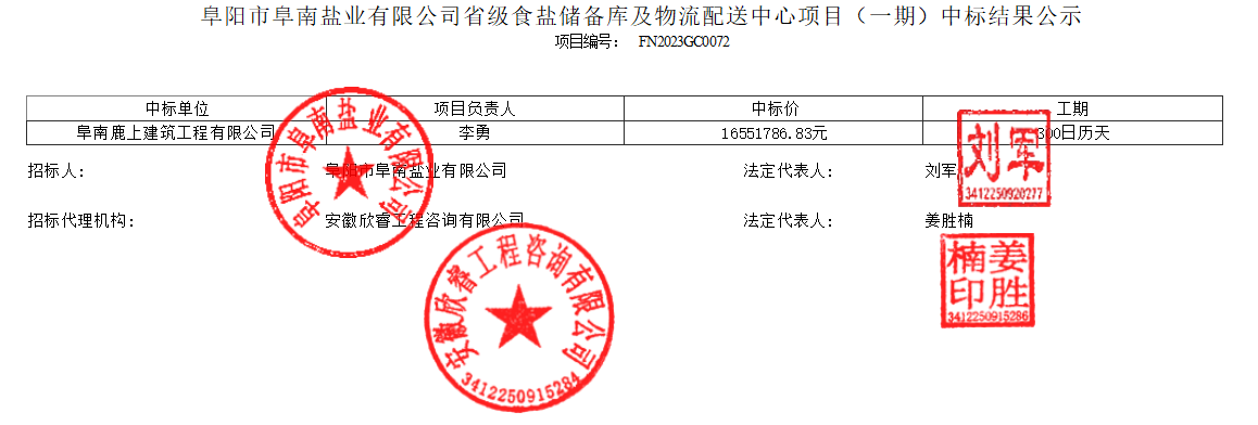 阜陽(yáng)市阜南鹽業(yè)有限公司省級(jí)食鹽儲(chǔ)備庫(kù)及物流配送中心項(xiàng)目(一期)中標(biāo)結(jié)果公示