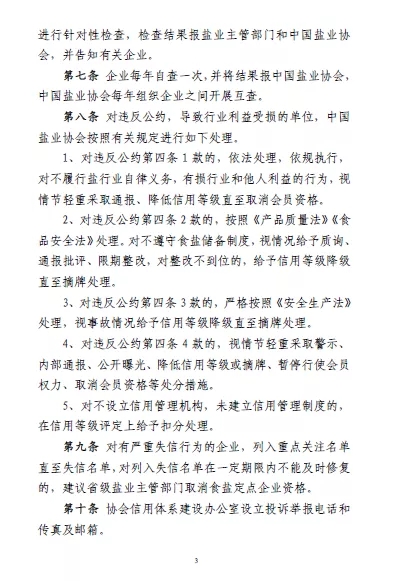 對違反公約第四條 1 款的(守法合規(guī)),依法處理,依規(guī)執(zhí)行,對不履行鹽行業(yè)自律義務,有損行業(yè)和他人利益的行為,視情節(jié)輕重采取通報、降低信用等級直至取消會員資格。