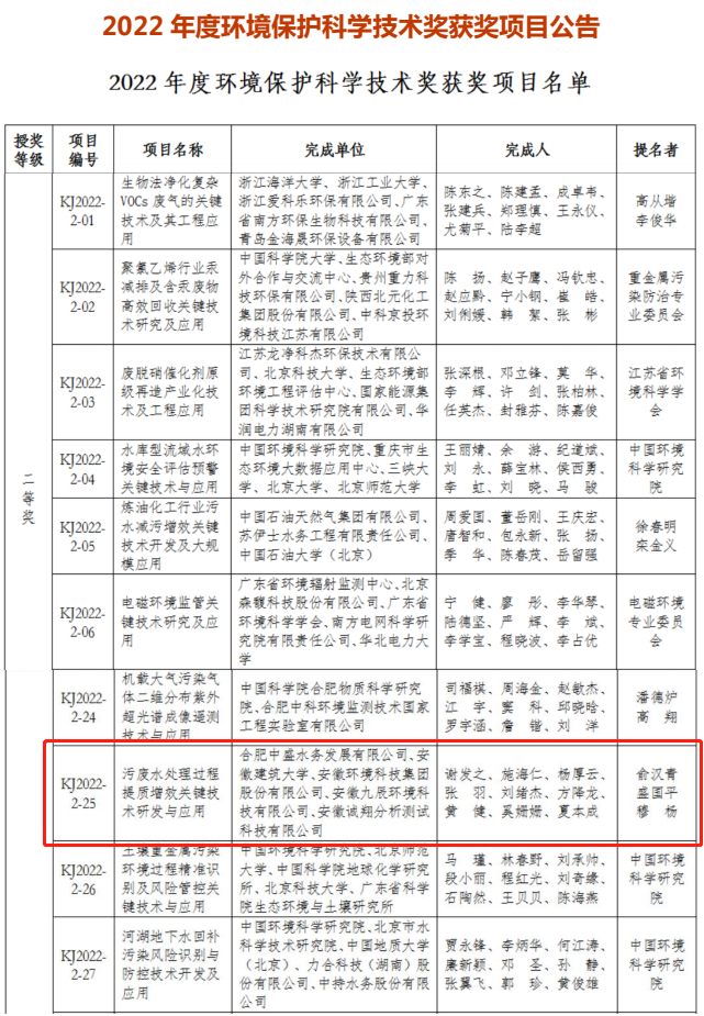 近日,中國環(huán)境科學(xué)學(xué)會對外發(fā)布了2022年度環(huán)境保護科學(xué)技術(shù)獎獲獎名單,由安徽環(huán)境科技集團與合肥中盛水務(wù)、安徽建筑大學(xué)等單位共同研發(fā)攻關(guān)的技術(shù)成果“污廢水處理過程提質(zhì)增效關(guān)鍵技術(shù)研發(fā)與應(yīng)用”榮獲二等獎。