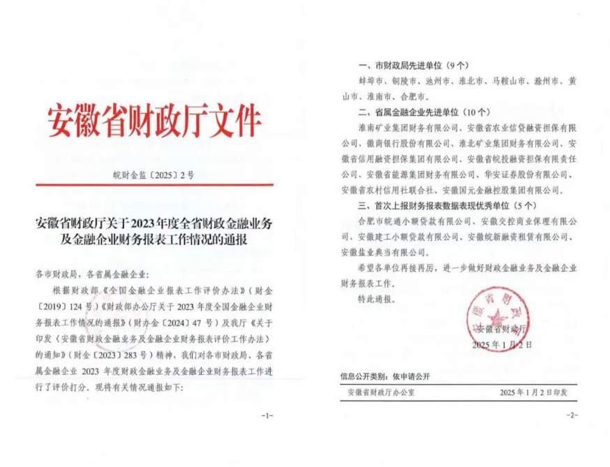 近日,安徽省財(cái)政廳依據(jù)《全國金融企業(yè)報(bào)表工作評(píng)價(jià)辦法》等相關(guān)文件精神,對(duì)各市財(cái)政局和省屬金融企業(yè)2023年度財(cái)政金融業(yè)務(wù)及金融企業(yè)財(cái)務(wù)報(bào)表工作進(jìn)行了評(píng)價(jià)。徽鹽典當(dāng)公司榮獲“首次上報(bào)財(cái)務(wù)報(bào)表數(shù)據(jù)表現(xiàn)優(yōu)秀單位”榮譽(yù)稱號(hào)。